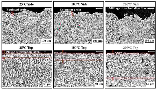 Figure 8 shows the microstructure of the cutting boundary, where the side is the edge parallel to the axis of the wear tool and the top is the edge perpendicular to the axis of the wear tool. The microstructures on the side of the sample are columnar-equiaxed bimodal microstructures common in laser additive manufacturing samples [29]. It is worth noting that at 25 °C, the side surface is uneven. When the preheating temperature is raised to 100 °C, the quality of the side surface improves, which then deteriorates again under 200 °C. This may be because, at a preheating temperature of 100 °C, the substrate is more prone to shear deformation under the effect of thermal softening, resulting in higher surface quality than at 25 °C. However, under 200 °C, the high temperature and high pressure during the milling process cause the material to adhere to the surface of the milling cutter, which has an adverse effect on the surface quality of the side edges. On the top edge, it was found that the surface grains were twisted and deformed [30]. This deformation layer is caused by the huge shear force generated by the contact between the milling cutter and the substrate during the milling process, which causes the grains on the surface of the machined surface to deflect. As the preheating temperature increases, the width of the plastic deformation layer gradually increases. This is due to the high temperature causing thermal softening of the material surface. When in contact with the milling cutter, a plowing effect is generated on the machined surface, which becomes more significant with increasing cutting speed and temperature [31,32]. The maximum thickness of the plastic deformation layer reaches 175 μm under the preheating temperature of 200 °C.