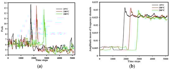 The results of vibration testing during the cutting tool process are shown in Figure 9. It can be seen that the increase in substrate temperature reduces the amplitude of vibration at the starting point of milling. The peak value when the tool contacts the substrate decreases with an increase in temperature, as shown in Figure 9. During the milling process, the peak value and the amplitude mean of the frequency domain of the 25 °C substrate temperature are larger. It means that the hardness of the substrate decreases with an increase in the substrate temperature. However, the difference in the tool vibrations between the substrate temperatures of 100 and 200 °C is not obvious.