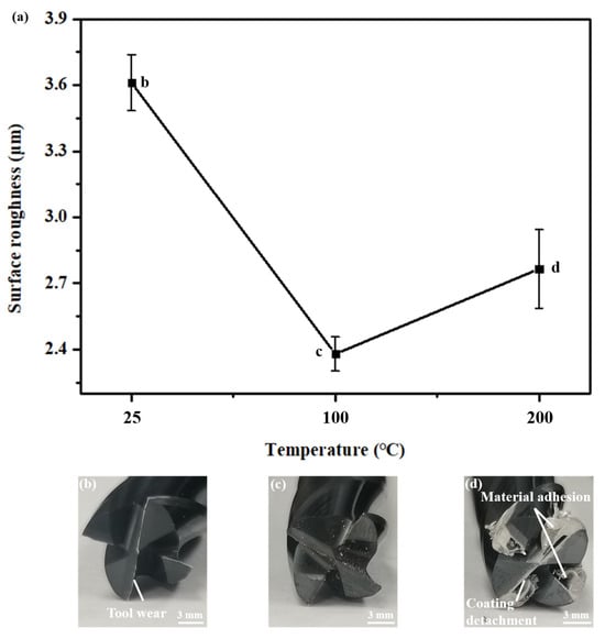 Effect of temperature on (a) surface roughness and (b–d) tool wear.