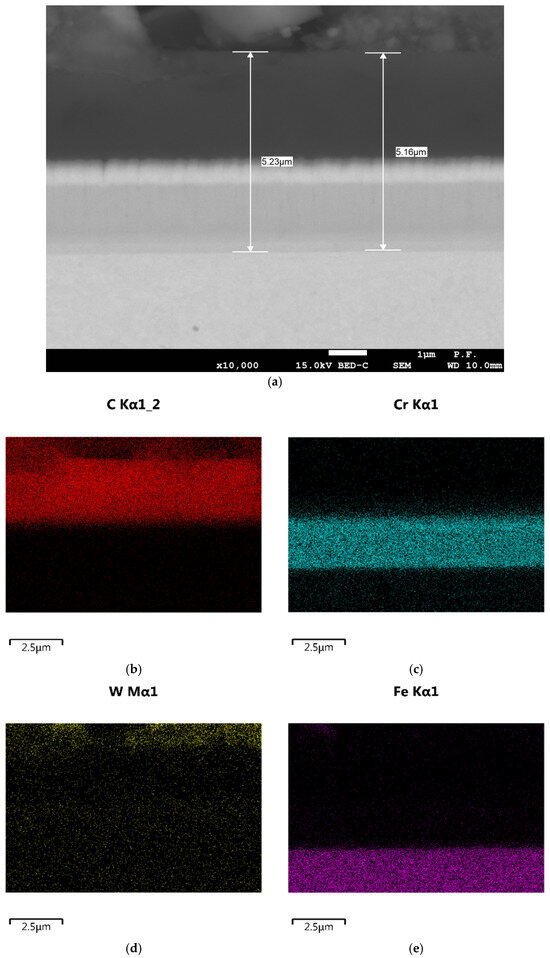 Transverse section of the WC/C coating: (a) thickness measurement; elemental distribution maps: (b) carbon, (c) chromium, (d) tungsten, (e) iron.