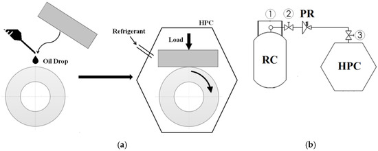 (a) Oil-refrigerant mixture preparation, (b) the instrumentation for supplying refrigerant: RC—refrigerant cylinder, PR—pressure reducer, HPC—high-pressure chamber, 1–3—ball valves.