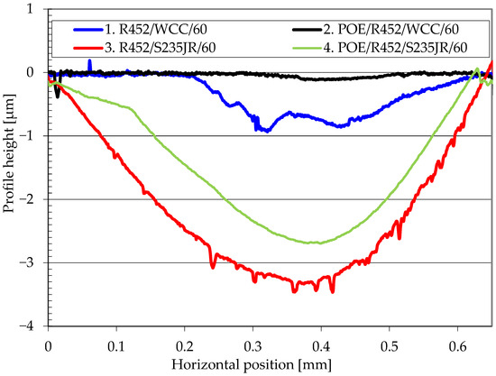 Figure 3 shows examples of the wear track profiles of the tested samples. The samples with the WC/C coating exhibited minimal wear (approximately 0.1 µm) under starved lubrication with the oil-refrigerant mixture (series 2). In contrast, samples with the WC/C coating tested without any lubricant (series 1) showed a track depth of about 0.9–1.0 µm. For steel samples without the WC/C coating, the wear track depth was 3.4 µm in the refrigerant environment (series 3) and approximately 2.6 µm under starved lubrication with the oil-refrigerant mixture (series 4).