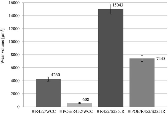 Table 3 summarizes the wear test results, including wear track widths and depths and the estimated volumetric wear. The standard deviation for the volumetric wear was calculated based on three test repetitions. The obtained results are also illustrated in Figure 4.