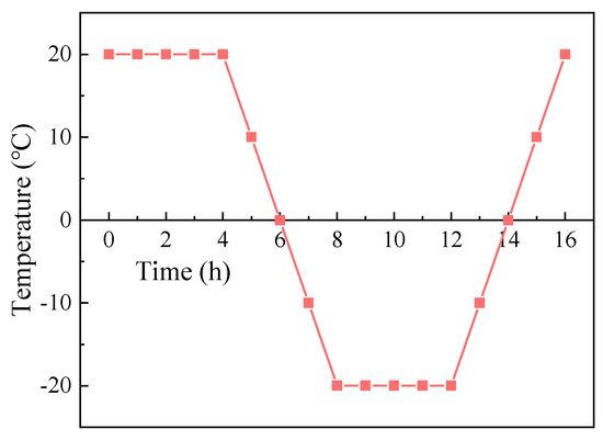 In accordance with GB/T 22235-2008, the samples cured for 28 days were placed in a freeze-thaw cycling machine. The freezing temperature was set at −20 °C, and the thawing temperature at 20 °C, with a temperature hold time of 4 h. The temperature transition time was also set to 4 h, making the duration of a single cycle 16 h. The design of a single freeze-thaw cycle is illustrated in Figure 3.