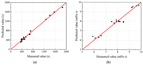 Comparison between measured and predicted values. (a) Gel time. (b) Initial viscosity.