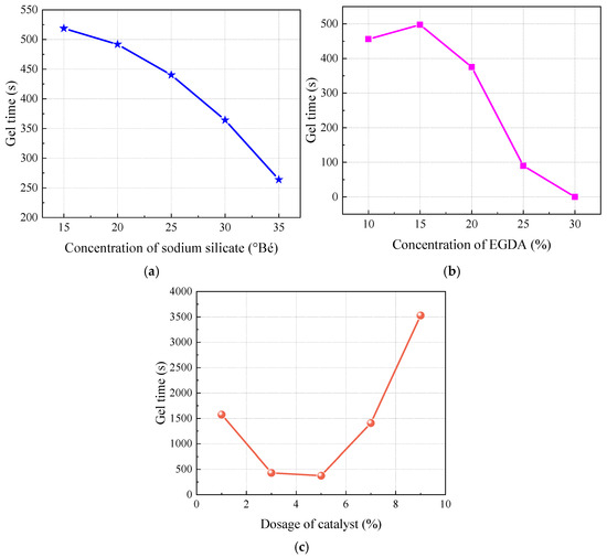 Influence of a single factor on gel time. (a) Concentration of sodium silicate. (b) Concentration of EGDA. (c) Dosage of catalyst.