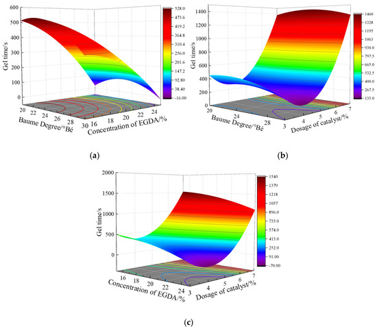 By observing the surface shape in Figure 6a, it can be seen that gel time does not change linearly with the two factors; rather, it is influenced by a nonlinear combination of these factors. When the Baume degree is fixed, gel time significantly decreases with the increase in EGDA, although the rate of decrease gradually diminishes as the Baume degree rises. When the EGDA dosage is held constant, gel time first increases and then decreases with the increase in Baume degree. However, as the EGDA dosage increases, the peak of the curve shifts from a Baume degree of 22.25 °Bé to 24.19 °Bé. The difference at both ends of the curve decreases from 94.38 s to 0 s, indicating that the curve becomes increasingly symmetrical.