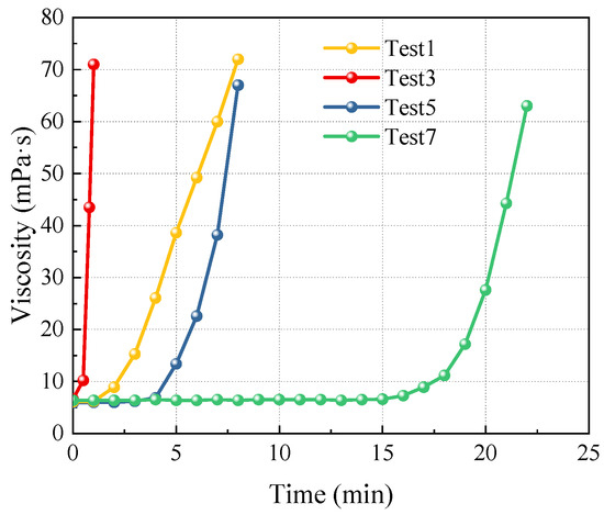The time-dependent viscosity of the slurry is a crucial indicator influencing grouting diffusion. A comparative analysis was conducted using the experiment at a Baume degree of 20°Bé, as illustrated in Figure 7.