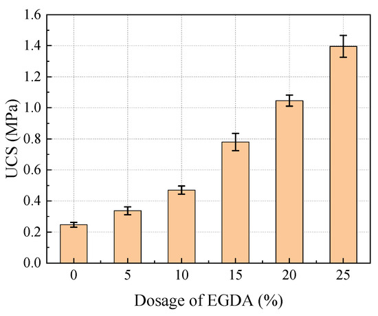 Figure 8 illustrates the UCS of moraine consolidated bodies with varying EGDA dosages before undergoing freeze-thaw cycling. The UCS exhibits a positive correlation with the amount of EGDA added. Notably, the UCS of the sample without any added EGDA was only 0.26 MPa., serving as the control group. As the EGDA dosage increased from 5% to 25%, the growth rates of UCS were recorded at 36%, 92%, 208%, 320%, and 456%, respectively. This demonstrates that the addition of EGDA significantly enhances the mechanical strength of the samples.