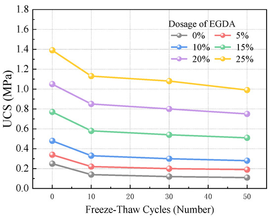 Figure 9 depicts the changes in UCS of the consolidated bodies after freeze-thaw cycling. The UCS initially declines rapidly and then decreases more gradually. After 10 freeze-thaw cycles, the UCS reduction percentages for EGDA dosages ranging from 0% to 25% were 44.00%, 35.29%, 31.25%, 24.68%, 19.05%, and 18.71%, respectively. From 10 to 50 cycles, the reduction percentages were 12%, 8.82%, 10.42%, 9.09%, 9.52%, and 10.07%. In the early stages of freeze-thaw cycling (≤10 cycles), the UCS declines sharply due to significant internal structural instability, leading to a rapid loss of load-bearing capacity. In contrast, in the later stages (>10 cycles), the UCS decreases more slowly as the remaining bonded structures stabilize after the failure of weaker components. The impact of freeze-thaw cycling on these stable structures is limited, allowing for better maintenance of load-bearing capacity. This suggests that after undergoing extensive freeze-thaw cycling, the internal damage of the consolidated body reaches a threshold, causing the UCS to stabilize at a certain value.