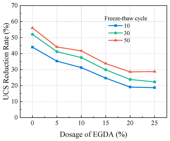 As shown in Figure 10, the strength attenuation rate decreases continuously with the increase in EGDA content. In the samples subjected to 30 freeze-thaw cycles, as the EGDA content increased from 5% to 25%, the UCS reduction rates were 41.18%, 37.50%, 29.87%, 23.81%, and 22.30%, respectively. In contrast, the sample without EGDA shows a reduction of 52%. Adding EGDA can improve the UCS by 10% at least. Clearly, incorporating EGDA effectively reduces the number of weak structures within the consolidated body, thereby improving its resistance to freeze-thaw cycles.