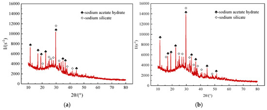 To reveal the curing products and study the hardening mechanism of ester-modified sodium silicate grout materials, samples with 5% and 15% EGDA were selected for XRD testing. The XRD patterns are presented in Figure 11. Both samples exhibit two crystalline phases: sodium acetate hydrate and sodium silicate. Additionally, a diffuse peak of amorphous SiO2 appears in the 2θ range of 20° to 40°, indicating the presence of silica gel. The formation of sodium acetate hydrate is associated with the presence of acetic acid or an acidic environment during the reaction. Sodium silicate may indicate that some of the sodium silicate did not fully react, contributing to a complex network structure alongside the lipid. The formation of amorphous silica (silica gel) results from the polymerization reaction. The interactions among these components collectively influence the performance and application characteristics of the final gelation product.