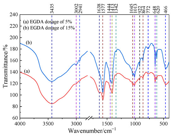 As shown in Figure 5b, with the increase in EGDA dosage, the gel time gradually decreases, indicating that the addition of EGDA accelerates the gelation process. EGDA acts as a crosslinking agent capable of bridging multiple silicate molecules to form a crosslinked network structure. The addition of EGDA increases the crosslinking density of sodium silicate, thereby speeding up the formation of the gel network and making the gelation reaction occur more rapidly.