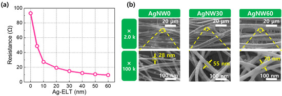 (a) The resistance of Ag-NW-embedded fabrics as a function of Ag-ELT. (b) SEM micrographs showing the morphologies of AgNW0, AgNW30, and AgNW60, respectively. The average Ag NW diameters are included in the images.
