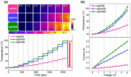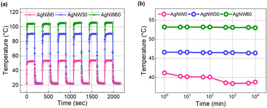 (a) The temperature profiles of AgNW0, AgNW30, and AgNW60 during repeated cycles of applying an external voltage (6 V) for 3 min, followed by a 3 min pause. (b) Temperatures for AgNW0, AgNW30, and AgNW60 while a fixed external voltage (3.5 V) is applied for a duration of 10,000 min.