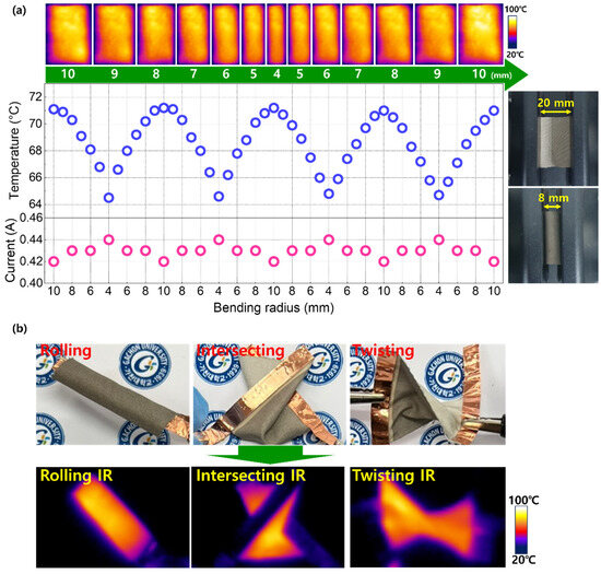 In addition to the thermal reproducibility and long-term stability examined in Figure 4, a key requirement for heatable fabrics is the capability of maintaining heating performance under highly strained conditions. Figure 5a shows the heating performance of AgNW60 during repetitive mechanical bending at a constant applied voltage of 4.5 V, along with the infrared (IR) images captured at various bending radii. While varying the bending radius from 10 to 4 mm, the fabric temperature dropped by 9.3%, along with an increase in electrical current by 4.8%. At the increased bending radius of 10 mm, however, both the fabric temperature and current reverted to their original values. This indicates that the temperature drop was due to enhanced heat dissipation associated with the increased structural deformation [38,39,40] rather than a permanent degradation in heating capability. The concurrent increase in electrical current with decreasing fabric temperatures could be attributed to reduced phonon scattering at lower temperatures. Figure 5b displays the heating performance of the fabric under complex deformation states, simulating realistic conditions for wearable electronics. The fabric demonstrated efficient heating performance in all scenarios, validating the suitability of the proposed method for producing durable and reliable heating fabrics.