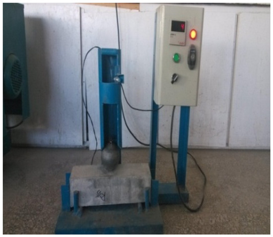 - Impact toughness can characterize the ability of concrete materials to absorb energy under dynamic loads. The higher the impact toughness of concrete, the stronger its ability to resist dynamic loads, and vice versa. The impact resistance test of fiber-reinforced lightweight aggregate concrete was carried out according to the concrete impact resistance test method, and the effects of the freeze–thaw cycles and fiber content on the impact toughness of lightweight aggregate concrete were analyzed. The test used a drop hammer impact tester, as shown in Figure 1, with a drop hammer mass of 3 kg and an impact height of 300 mm.
