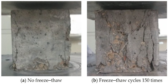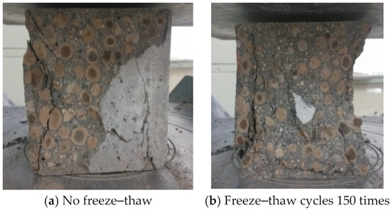 - During the freeze–thaw cycle, the pore water inside the concrete freezes and generates tensile stress, and tensile cracks are generated inside the concrete. Under the action of repeated freeze–thaw cycles, the cracks gradually accumulate and expand, eventually leading to the destruction of the concrete structure. Freeze–thaw cycles have a great impact on the strength of ordinary lightweight aggregate concrete. After 150 freeze–thaw cycles, the strength loss rate exceeds 25%.