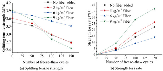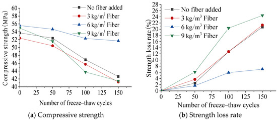 Figure 6 shows the influence of freeze–thaw cycles on the splitting tensile strength. When the fiber content was low (0 kg/m3, 3 kg/m3, and 6 kg/m3), the splitting tensile strength of the concrete decreased relatively slowly in the early stage of freeze–thaw, and gradually accelerated with the increase in freeze–thaw cycles in the later stage. When the fiber content increased to 9 kg/m3, the loss rate of the splitting tensile strength was much higher than that of other concretes. This is because adding too much fiber increased the interface between the fiber and the cement matrix, and the damage to the interface area caused by freeze–thaw action also increased, resulting in a decrease in the bond strength between the fiber and the matrix. When the concrete was subjected to splitting load, the fiber with a low bond strength with the matrix would not be able to effectively disperse the stress concentration at the tip of the crack, and the fiber that can continue to bear tensile stress was greatly reduced, thereby reducing the splitting tensile strength of the concrete. The concrete with a fiber content of 6 kg/m3 had the smallest strength loss rate due to its reasonable content.
