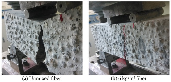 Flexural strength is an important indicator of concrete’s tensile properties. The fiber-reinforced lightweight aggregate concrete was subjected to flexural tests using the three-point loading method, and the failure morphology is shown in Figure 7. Comparison with Figure 7 shows that the lightweight aggregate concrete without fibers fractured brittlely under load. When the first main crack appeared on the lower surface of the specimen, the cracks rapidly expanded upward, causing the specimen to break suddenly. Lightweight aggregate concrete with 6 kg/m3 fiber showed good ductility characteristics under load. When cracks appeared on the surface of the specimen, the cracks slowly extended with the increase in load. When the specimen was destroyed, the crack width was small due to the constraint of the fiber, and the cracking changed from a main crack to parallel fine cracks. Finally, the specimen remained as a whole when it was destroyed.