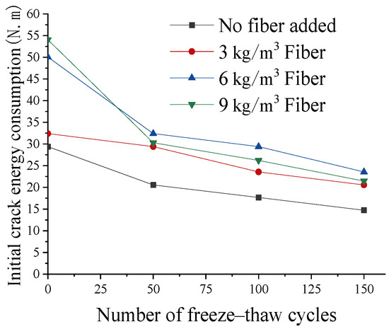 The effect of freeze–thaw cycles on the initial crack energy consumption is shown in Figure 9. The initial crack energy consumption of lightweight aggregate concrete without freeze–thaw cycles increased with the increase in the fiber content, mainly because the initial crack in the concrete was related to the number of fibers distributed horizontally in the bottom tensile zone, that is, the bottom fibers could effectively offset part of the impact energy consumption [31]. With the increase in freeze–thaw cycles, the impact toughness of the fiber-reinforced coarse aggregate concrete decreased rapidly, and the influence of freeze–thaw damage on the impact toughness was greater than the compressive strength and flexural strength under static load. Before freeze–thaw, the initial crack energy of the fiber concrete (6 kg/m3) was 76% greater than that of ordinary concrete, but after the cycle, it was only 49% greater. This was mainly because the freeze–thaw cycle destroyed the bonding strength of the fiber–matrix interface and reduced the ability of the fiber to withstand impact loads.