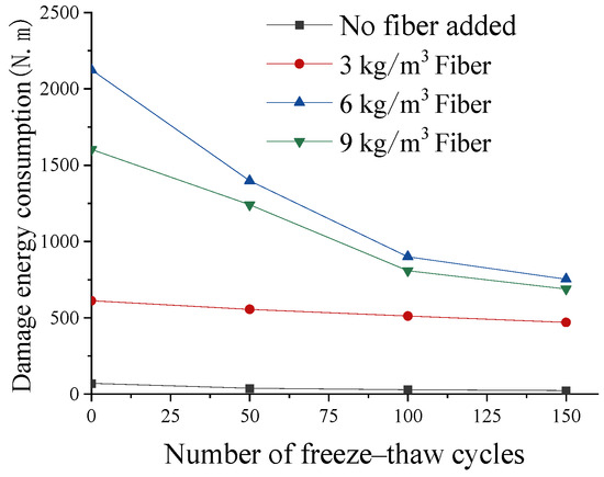 The destruction energy consumption of different specimens is shown in Figure 10. The damage energy consumption of lightweight aggregate concrete increased with the increase in fiber content. The addition of fiber significantly improved the energy consumption ability of concrete to resist damage. The damage energy consumption of lightweight aggregate concrete without fiber and with a fiber content of 3 kg/m3 is much lower than that of lightweight aggregate concrete with a fiber content of 6 kg/m3 and 9 kg/m3. With the increase in freeze–thaw cycles, the destructive energy consumption gradually decreased. Freeze–thaw had a greater weakening effect on the destructive energy consumption of concrete with a higher fiber content. However, lightweight aggregate concrete with fiber added still had a stronger ability to offset the impact energy consumption after freeze–thaw cycles than that without fiber.