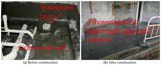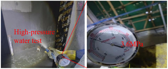 In the backfilling construction of the sunken bathroom, preparatory work was first completed, including cleaning the base layer and preparing materials and equipment for the fiber-reinforced lightweight aggregate concrete. During base layer cleaning, it was ensured that there was no debris or standing water, and waterproofing treatment was conducted if necessary. Next, formwork and partitioning were carried out, with templates set in the construction area to ensure concrete molding quality, and pipeline positions were reserved where needed. The concrete was mixed according to the proportions in Table 2, with fibers added in two stages and mixed thoroughly to ensure an even distribution of fibers. After pouring, it was compacted with a vibrator, with special attention paid to the compactness of corners. After leveling the surface, wet curing was performed, keeping the concrete surface moist for about seven days to ensure adequate strength development. The measured rebound strength of the concrete is shown in Table 4. At 28 days, the strength reached 52.3 MPa, exceeding the design strength. As shown in Figure 13, a high-pressure water test (water pressure greater than 3 bars) was conducted, with each 10 square meters tested for 5 min, and no leakage points were found. As shown in Figure 14, the concrete surface remained intact without cracks, and there was no seepage after the water immersion test.