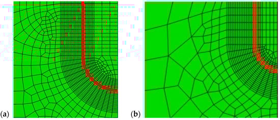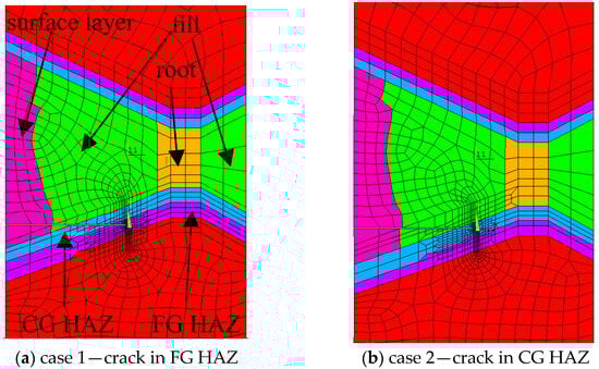 The simplified FEM model of welded joints—fine-grained HAZ (a) and coarse-grained HAZ (b) [17].