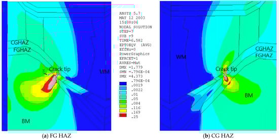 Equivalent strain distributions for the remote stress 292 MPa, for fine-grained HAZ (a) and coarse-grained HAZ (b) [17].