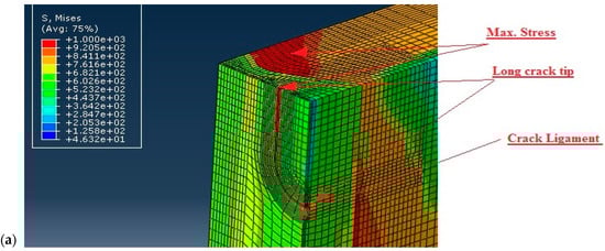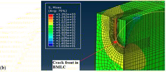 As shown in Figure 5, there is a significant difference in stress distribution around the LSC in the WM and BM. One can see that the maximum stress in the BM is located at the crack tip, whereas the maximum stress in the WM is not only at the crack tip, but also in the BM. Such a redistribution of stresses and strains is beneficial for welded joint resistance to cracking, since it increases the crack resistance of the WM. The same comparison holds for the SSC, Figure 6, with the same consequences regarding the undermatching effect. Nevertheless, one should keep in mind that in both cases, in the SSC and LSC, the undermatching effect is beneficial only if the WM is capable of sustaining at least a small amount of plastic strain, which is the case here, as shown in Table 2, since the WM strain is over 20%.