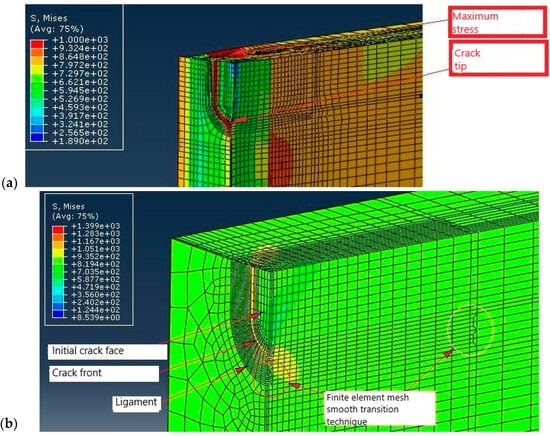 Comparison of the effects of SSC tip stress fields in (a) WM, (b) BM. Stresses in MPa [18].