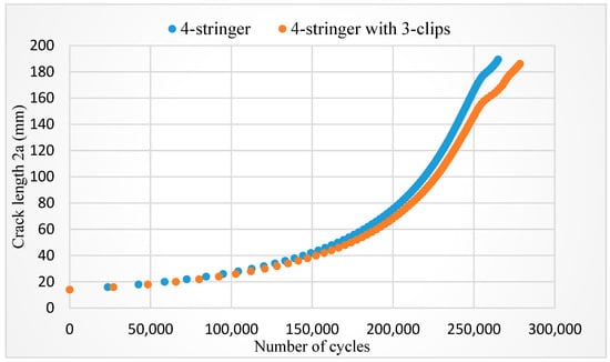 Crack length vs. number of cycles for P + 4S and P + 4S + 3C [34].