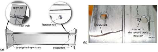 As the main load-carrying member of the aircraft wing, a spar is usually of an I-beam shape, made of a thin shear panel (web) and flanges (caps) at the top and bottom (Figure 10a), assembled by rivets [35,40,41,42]. A typical problem with wing spars, especially in light aeroplanes, since they have only one per wing, is fatigue crack initiation from the most severe stress concentration on the spar bottom cap, typically a fastener hole, as shown in Figure 10b. A crack can grow unnoticed, first in the spar cap, and then in the spar web, potentially leading to the failure of an aeroplane if not detected and repaired [30]. Furthermore, the design of the wing spar does not offer much of a choice in preventing this scenario. Probably the only remaining option is to use welded joints instead of riveted wing spars, to improve fatigue life in the case of cracking, as described in [35,40,41,42].