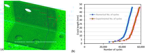 Afterwards, numerical simulation by XFEM was carried out, as described in [35,40,41,42], in two phases, first by modelling the riveted spar, and then by modelling the welded spar of the same geometry. The load used in all crack growth simulations (for both integral and differential spars) was a narrow-band random loading with a maximum displacement of 3 mm applied at one end of the spar. The other end of the spar was constrained. This displacement was identical to displacement maintained in experiments with the differential spar. The frequency of the applied displacement was 3 Hz. The initial crack was positioned at the edge of the left upper cap zone, as shown in Figure 11a, to simulate the experiment as closely as possible. A comparison of the experimental and numerical results is shown in Figure 11b, in the form of crack length vs. number of cycles, revealing excellent agreement, since the difference was very close to the number of cycles obtained by the experiment carried out to initiate the crack, which was not modelled by XFEM. However, the crack path on the vertical spar wall did not completely match the path observed in the experiment, which was attributed to local material effects being stronger than the geometry itself.