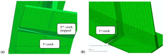 XFEM modelling of the welded spar, with dimensions and mass equivalent to the riveted spar, included the initial penny-shaped cracks inserted at the left and right edge of the spar cap, as described in more details in [40,41,42]. The path of the first crack on the spar was not straight, but slightly curved (Figure 12), while the second crack did not propagate after the eighth step; deformation of the spar caused by the first crack literally “closed” the second crack. The first crack then split and continued to grow simultaneously in the spar (1st front, Figure 12a) and in the web (2nd front, Figure 12b). An improvement in the number of cycles was significant, from 50 Kcyc to more than 200 Kcyc for the same geometry and mass, and up to 2 Mcyc after optimisation of the welded spar, as shown in [42].
