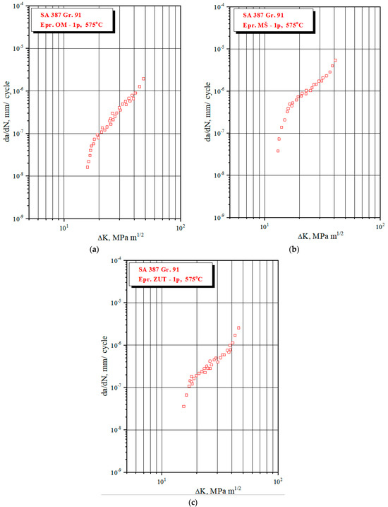Fatigue crack growth rate vs. ΔK diagrams for 575 C, (a) BM, (b) WM, (c) HAZ [36].