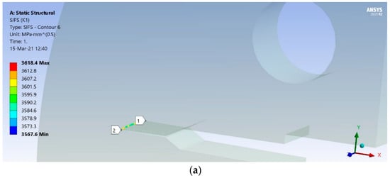 Five numerical models were created in ANSYS R19.2 software to enable the calculation of the stress intensity factors and the number of cycles to used reach the critical crack length. Boundary conditions and loads were defined as was the case in real experiments—one specimen was end-fixed and the other were subjected to a bending moment (values of bending moments corresponded to the ones from the actual equipment used for fatigue simulation), as shown in Figure 18, together with the FE mesh. Three models were made for the specimen no. 22 with crack growth from the BM, and then through the HAZ and WM. Results are shown in Figure 19 and in Table 5 and Table 6.