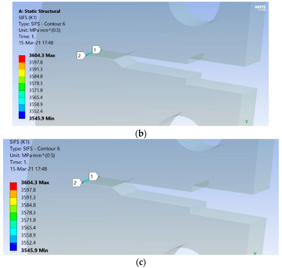 SIF distribution around the fatigue crack tip (5 mm length) for (a) BM, (b) WM, (c) HAZ [36].