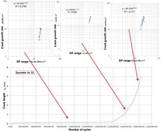 Crack length vs. number of cycles for specimen no. 22, with different slopes in different WJ zones [37].