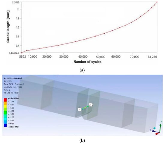 Results for (a) crack length vs. number of cycles, (b) SIF distribution [37].