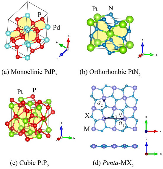 The planar pentagon 2D (P4g) material, namely penta-MX2 (M = Ni, Pt, Pd, X = N, P) monolayer, is built from relaxing one single layer of bulk MX2 crystals. We calculated the cohesive energies for both bulk phases and the pentagon 2D phase using the above-mentioned calculation strategy. Structural optimizations did not take the temperature effects into account [31]. A Monkhorst–Pack (MP) [25] k-point grid of dimensions 7 × 7 × 7 was utilized. The lattice parameters obtained from our optimization closely match the experimental data, as detailed in Table 1. The stable bulk phases of PdP2, PtN2, and PtP2 are monoclinic (C12/c1) [32], orthorhombic (Pnnm) [33], and cubic (Pa-3) [34,35,36,37,38,39] structures, respectively, all of which have been successfully synthesized in experiments. Our energetic calculations indicate that the orthorhombic (Pnnm) and cubic (Pa-3) phases of bulk NiN2 are nearly energetically equivalent, with the orthorhombic phase slightly more stable by about 0.055 eV/atom.