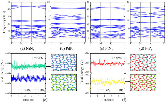 Phonon spectrum of (a) penta-NiN2, (b) penta-PdP2, (c) penta-PtN2, and (d) penta-PtP2 monolayer. Ab initio molecular dynamics simulation (AIMDS) of (e) penta-NiN2 monolayer and penta-PtN2 monolayer, (f) penta-PdP2 monolayer and penta-PtP2 monolayer.