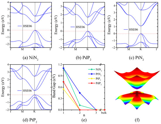 (a–d) Electronic band structures of penta-MX2 monolayer, calculated by using the HSE06 functionals. (e) Band gap of penta-MX2 monolayer, bilayer and three layers by using the HSE06 functionals. The number of layers is represented by n. (f) Three-dimensional TB band structures of the sixth band (highest VB) and the seventh band (lowest CB) of penta-PtP2 with TB parameters of t0 = 2.138, γ = 1.717, γ′ = 0.57, and ε = 0.20 by fitting the HSE06 band structures in (d). The 3D energy-momentum dispersion is set in close proximity of the Fermi level calculated in the reciprocal space.