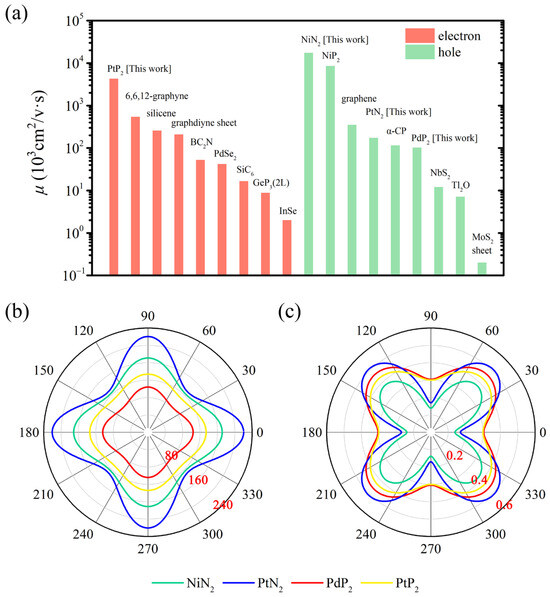 Plenty of 2D materials have been predicted as high-carrier-mobility materials in previous research [18,51,52,53,54,55,56,57,58,59,60,61], especially in hexagonal lattice. We compared the theoretical values of mobilities in pentagonal lattice (penta-MX2) with them, as illustrated in Figure 4a. To guarantee a fair comparison, all the listed theoretical values were determined employing the same approach, specifically the PBE functional. The results clearly demonstrate that the carrier mobilities of pentagonal materials stand out among these 2D high-mobility materials, especially much higher than those of hexagonal materials, such as graphene (3.51 × 105 cm2 V−1 s−1) [18,52], 2L graphene (4.64 × 105 cm2 V−1 s−1) [18], silicene (2.58 × 105 cm2 V−1 s−1) [52], BC2N (5.26 × 104 cm2 V−1 s−1) [54], PdSe2 (4.20 × 104 cm2 V−1 s−1) [55], BC6N (12.90 × 103 cm2 V−1 s−1) [62], 2L GeP3 (8.84 × 103 cm2 V−1 s−1) [57], Tl2O (7.12 × 103 cm2 V−1 s−1) [51], and MoS2 sheet (2.00 × 102 cm2 V−1 s−1) [61].