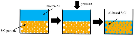 The object of this study was SiCp/Al with an SiC content of 65%. In this study, the method of pressure casting was chosen as the preparation method for SiCp/Al [26,27]. The preparation principle is represented in Figure 1: (a) SiC particles are placed in the forming cavity. (b) The molten aluminum substrate is sprayed into the cavity through a high-speed and high-pressure nozzle. (c) A certain pressure is applied to the molten aluminum substrate and stability is maintained for a period of time. During this process, the molten aluminum matrix fills the gaps of SiC particles. (d) After cooling, multiphase composite materials can be obtained. The thickness of each test sample is 4 mm.