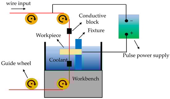 All WEDM experiments were completed on a five-axis low-speed WEDM machine tool (ACCUTEX Au-300i, Taiwan, China). The schematic diagram of the machine is shown in Figure 2, which mainly includes a CNC system, the discharge system, the wiring system, and the workbench. Table 1 lists the main technical parameters of machining equipment. During discharge processing, the workpiece was immersed in deionized water, and the electrode wire was a 0.25 mm diameter brass wire.