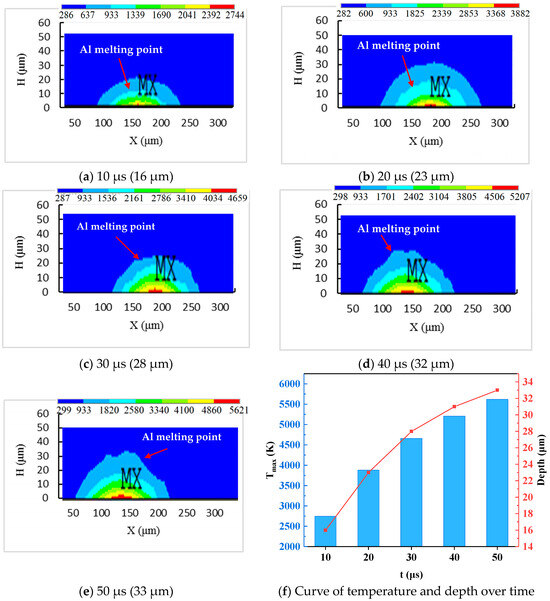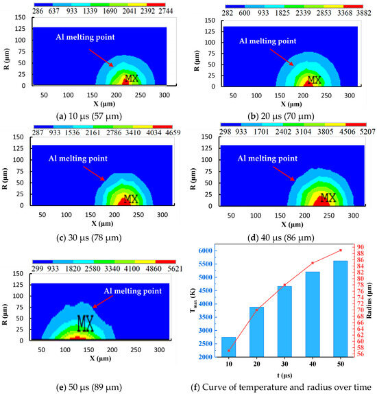 Figure 6 shows the temperature distribution along the radius direction of the workpiece at different times. The process factors include a Ton of 50 μs, a discharge peak current of 15 A, and an SV of 45 V. It can be observed that at the 10 μs moment, the melting radius of the aluminum substrate is 57 μm. As the discharge time increases, the melting radius of the aluminum substrate also increases. At the 50 μs moment, the melting depth of the aluminum substrate is 89 μm. Combining Figure 5 and Figure 6, the entire discharge crater can be approximated as an ellipsoid. The radius direction and depth direction are the major and minor axes of the ellipse, respectively. In addition, as the discharge time increases, the volume of the ellipse first increases rapidly and then increases slowly.