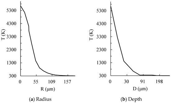 Figure 7 shows the temperature curve in the radius and depth directions. The discharge parameters include a Ton of 50 μs, a discharge peak current of 15 A, and an SV of 45 V. From Figure 7, it can be seen that the material temperature drops with the increase in discharge radius and depth. The highest temperature on the machined surface is obtained at the discharge center point. Figure 7a represents the temperature distribution of the workpiece in the radial direction. It can be observed that, when the radius is less than 12 μm, the temperature of the workpiece decreases relatively slowly. When the radius is greater than 12 μm, the temperature of the workpiece decreases rapidly. This phenomenon is mainly due to the fact that, within the discharge radius, the heat flux variation in the workpiece includes the input of discharge energy and the output of thermal convection. Beyond the discharge radius, the heat flux variation in the workpiece only includes the output of thermal convection. Figure 7b shows the temperature distribution in the depth direction. It can be observed that when the depth is less than 26 μm, the workpiece temperature rapidly decreases along the depth direction. When the depth is greater than 26 μm, the temperature of the workpiece slowly decreases until room temperature. This phenomenon is mainly because the heat transfer mode in the depth direction only includes heat conduction, and the thermal transfer is directly related to temperature gradient. At a depth of 26 μm, due to the influence of phase change, the rate of temperature change undergoes a sudden change.