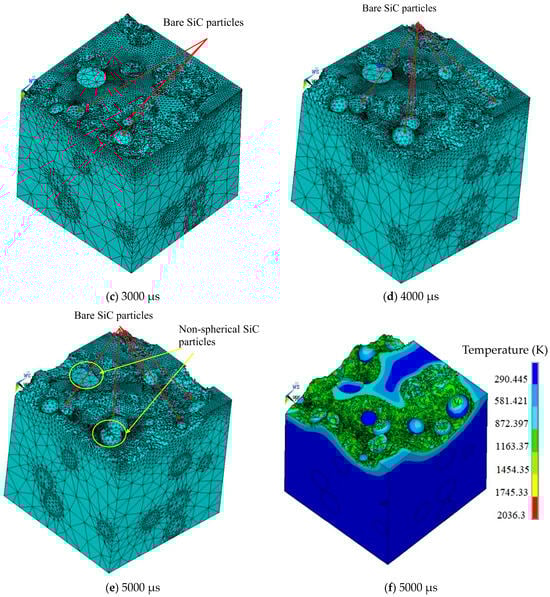 Figure 8 shows the discharge microtopography after MPDP machining at different times. The discharge factors are as follows: Ton = 50 μs, I = 10 A, U = 45 V, and Toff = 30 μs. In Figure 8a, only two SiC particles are located on the simulation unit surface. In Figure 8b, some of the aluminum matrix disappears on the surface of the simulation unit, and two SiC particles are exposed due to the melting or vaporization of the aluminum matrix. As the discharge time increases, more and more Al substrates disappear. At the same time, more and more SiC particles with increasing volumes are exposed. In Figure 8e,f, some non-spherical SiC particles are found. These phenomena are mainly due to the fact that, according to the thermophysical properties of Al and SiC, the heat decomposition temperature of SiC is much higher than the melting point of Al, and even higher than the boiling point of Al. So, when the discharge energy is loaded on the workpiece surface, the Al matrix will first be melted or vaporized and absorb a large amount of heat. When the temperature exceeds the heat decomposition temperature of SiC, some SiC particles will be thermally decomposed. When most of the Al matrix around the SiC particles is melted, these SiC particles will fall off into the dielectric under the action of gravity or dielectric erosion.