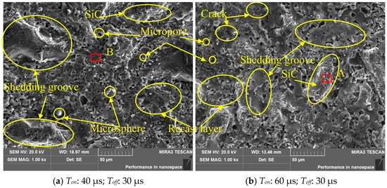 Figure 9 shows the SEM results of the sample surface. From Figure 9, it can be seen that cracks, microspheres, micropores, and recast layers appeared on the machined surface. The principle of WEDM is similar to that of EDM. When a large amount of concentrated discharge heat acts on the workpiece surface, the workpiece material is melted or vaporized under the high temperature. The melted or vaporized workpiece material is thrown out because of the action of impact, electric field, and flow field. Then, a discharge crater is generated on the machined surface. Under the cooling effect of the medium, the thrown workpiece material is transformed back into solid debris. Most of the discharge debris is expelled by the deionized water flushing. A small part of the discharge debris reattaches to the workpiece surface, which results in a complex morphology on the machined surface. These reattached debris become recast layers [37,38]. In addition, due to the randomness of the position of spark discharge points, the uneven insulation medium flow and the large temperature gradient, a certain amount of thermal stress is generated on the machined surface. If the thermal stress exceeds the tensile strength of the workpiece material, microcracks will be formed on the workpiece surface after the cooling effect of dielectric [39,40]. Moreover, a large number of micropores appear on the processed surface, which may come from the remaining gas in the pressure casting process, the bubbles generated during the discharge process, or the plastic deformation caused by the increase or decrease in temperature [41]. Furthermore, some relatively large protrusions (length of about 50 μm) are also found on the workpiece surface, which are larger than those observed in conventional discharge microtopography. These protrusions should be SiC particles. Some smooth and large pits (length of about 50 μm) are also found on the workpiece surface, which are larger than those in the conventional discharge microtopography. These pits should be the shedding grooves of SiC particles.
